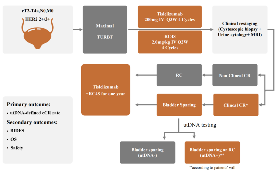 这是一项II期研究(ChiCTR2400080073),入组HER2过表达(IHC 2+或3+)的cT2-4aN0M0的MIBC患者。患者先接受最大化经尿道膀胱肿瘤电切术(TURBT),然后接受维迪西妥单抗(2.0 mg/kg,Q2W,4个周期)联合替雷利珠单抗(200 mg,Q3W,4个周期)治疗。达到cCR的患者考虑保膀胱,未达cCR的患者接受膀胱根治术。cCR定义为尿细胞学和磁共振成像(MRI)影像学结果正常,膀胱活检≤cTa。随后cCR患者进一步接受utDNA检测。utDNA检测为阴性的cCR患者保留膀胱,utDNA阳性的cCR患者根据其意愿保留膀胱或行膀胱根治术。最后所有患者接受维替雷利珠单抗治疗一年,随后进行监测。主要终点为utDNA定义的cCR率。次要终点为1年膀胱完整无病生存率(BIDFS)、OS和安全性。