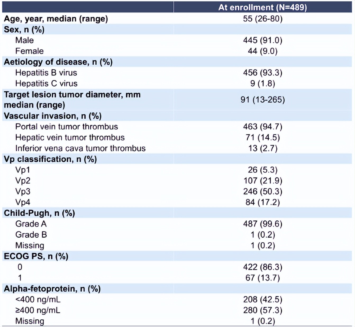 TALENTOP研究旨在探索系统治疗是否可作为晚期肝癌的有效转化治疗手段。这是一项国内多中心、前瞻性、随机对照临床研究。截至研究入组结束,全国共纳入489例患者(表1),其中201例肿瘤达到部分缓解(PR)或疾病稳定(SD)且仍具备手术条件的患者,进入第二阶段随机分组。我们将这201例患者按1:1随机分组,一组接受手术切除,另一组继续采用“T+A”方案进行药物治疗。