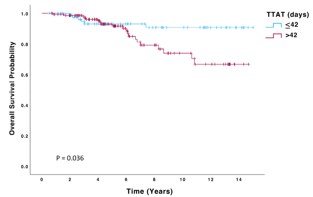 这是一项来自爱尔兰的单中心回顾性研究,分析了手术治疗后接受曲妥珠单抗辅助治疗且未接受过新辅助治疗的HER2阳性乳腺癌患者。患者根据术后至曲妥珠单抗辅助治疗时间(TTAT),分为TTAT≤42天或TTAT>42天两组。TTAT定义为HER2阳性浸润性乳腺癌初次手术至开始曲妥珠单抗辅助治疗的时间间隔。关键终点包括总生存(OS)、无病生存(DFS)和无远处转移生存(DMFS),通过Kaplan-Meier和Cox回归分析进行评估。