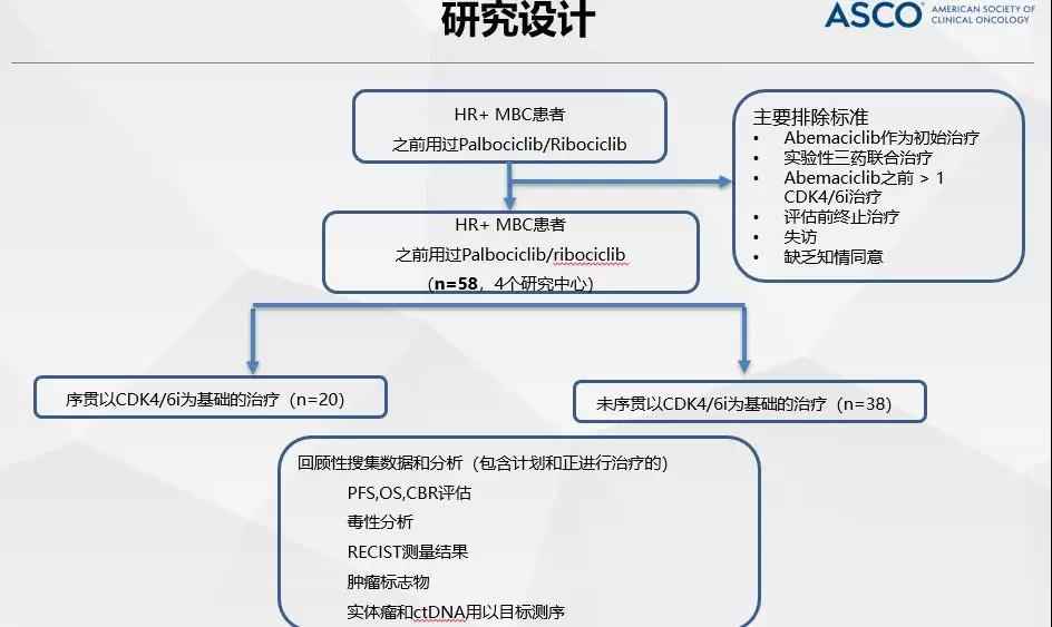第一项研究(摘要号:1057)回顾性研究了对于Palbociclib治疗产生耐药以后,尝试再用Abemaciclib进行治疗。本研究回顾分析了美国医疗中心经过Palbociclib治疗后使用Abemaciclib的58位患者,23例(39.7%)患者在使用过Palbociclib后使用Abemaciclib时显示初始耐药(定义≤120天),27例(46.6%)患者在使用过Palbociclib后使用Abemaciclib时显示有临床获益(定义>120天,目前中位治疗时间251天,11/58例患者仍在治疗中),其中包括单药使用Abemaciclib(9/27)。