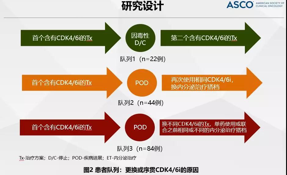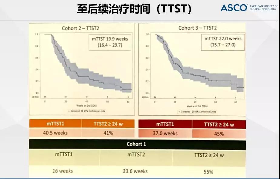 对于复发转移阶段曲妥珠单抗治疗后疾病进展的乳腺癌患者,继续使用曲妥珠单抗的预后优于停用靶向治疗的患者,提示持续的HER2通路抑制可使患者获益。而对于CDK4/6i是否可采用同样的策略,上述第二个研究(摘要号:1053)做了尝试。这个回顾性研究尝试了CDK4/6i跨线使用以及更换不同的CDK4/6i持续抑制CDK4/6信号通路。135例ER+MBC患者接收至少两线的含CDK4/6i的晚期治疗,50例患者接收3线含CDK4/6i的晚期治疗。队列2和3中二线中位使用时间为5个月左右,部分患者虽然在第一次CDK4/6治疗(24/84-29%)后进展,第二次使用CDK4/6i后(7/24 - 29%),在第一次反应影像评估时,却达到了肿瘤回缩和临床获益。
