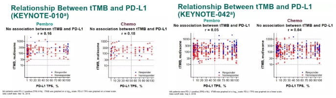 在tTMB与PD-L1相关性分析中,无独有偶,两项研究结果惊人般一致:不论是帕博利珠单抗组亦或化疗组,tTMB与PD-L1表达水平均无显著相关。