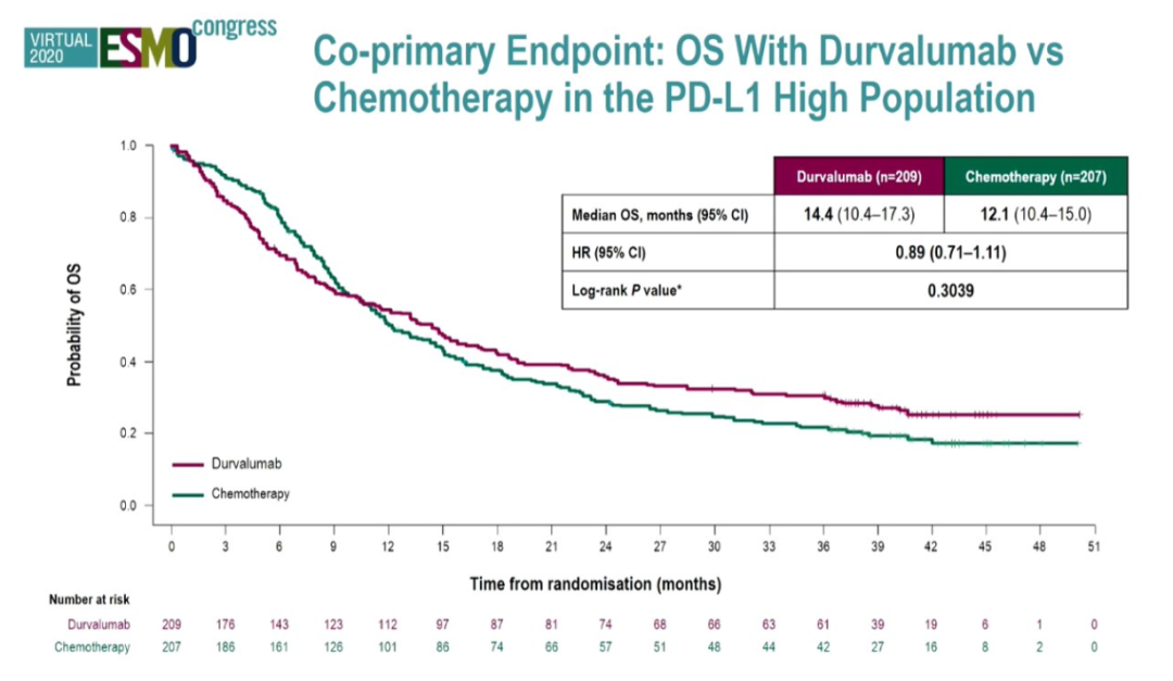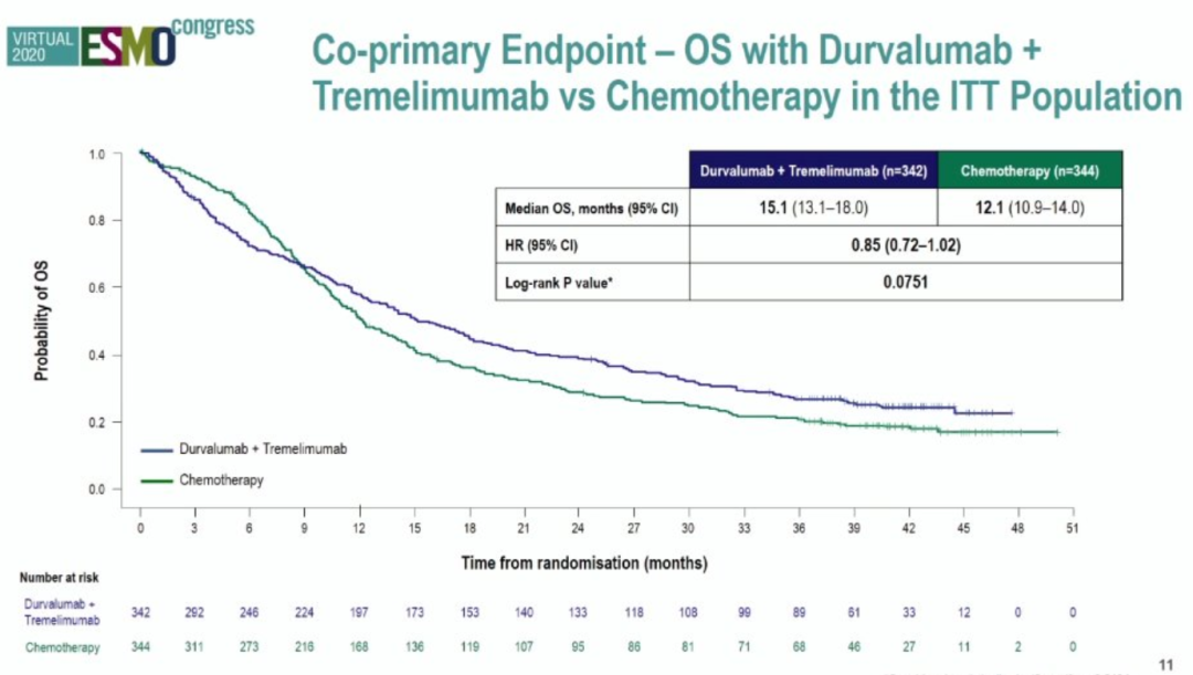 结果显示,双免疫联合治疗组,单用免疫治疗组以及单用化疗组的ORR分别为36%、26%和49%,3-4级治疗相关不良反应分别为28%、14%和60%。在ITT人群中,双免疫联合治疗组和单用化疗组的OS分别为15.1个月和12.1个月(P=0.0751);在PD-L1高表达人群中,单用Durvalumab对比单用化疗组的OS为14.4个月和12.1个月(P=0.3039)。