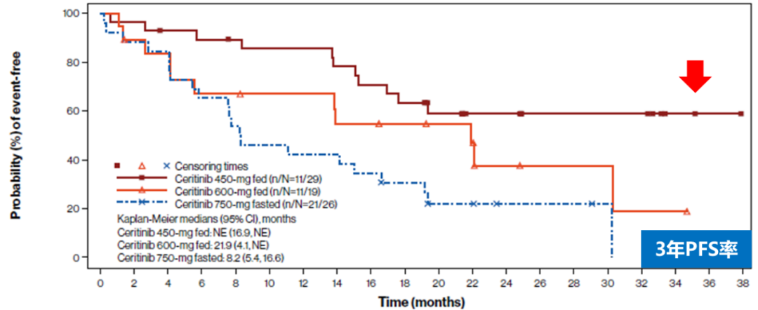 ASCEND-8的亚洲患者中,塞瑞替尼450mg随餐组的3年PFS率高达58.9%,近6成患者用药3年时仍未发生疾病进展。