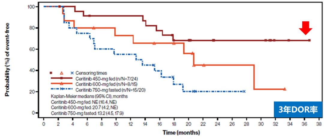 研究还分析了三组3年的疾病控制率(DCR),客观缓解率(ORR)及缓解持续时间(DOR),结果显示塞瑞替尼450 mg/d随餐组的DCR高达96.6%,ORR高达82.8%,3年DOR率高达68.2%!。