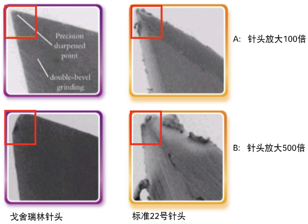 图3  戈舍瑞林针头锋利(对比标准22号针头,分别放大100和500倍仍锋利)