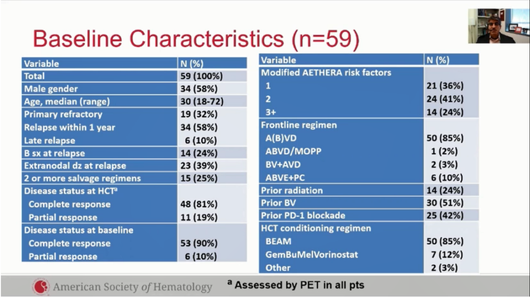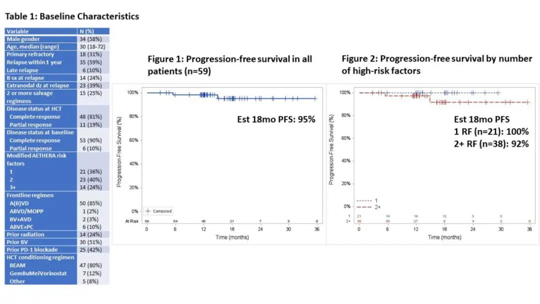 18例(31%)患者为原发性难治性,35例(59%)为早期复发,23例(39%)为结外转移,14例(24%)为复发时有其他症状,15例(25%)在HCT前接受 > 1次挽救治疗,48例(81%)在HCT时为CR。21例(36%)有1个改良AETHERA风险因素,23例(40%)有2个风险因素,14例(24%)有3个以上的风险因素。从研究治疗开始的中位随访时间为15.7个月(范围:2.8-35.5)
