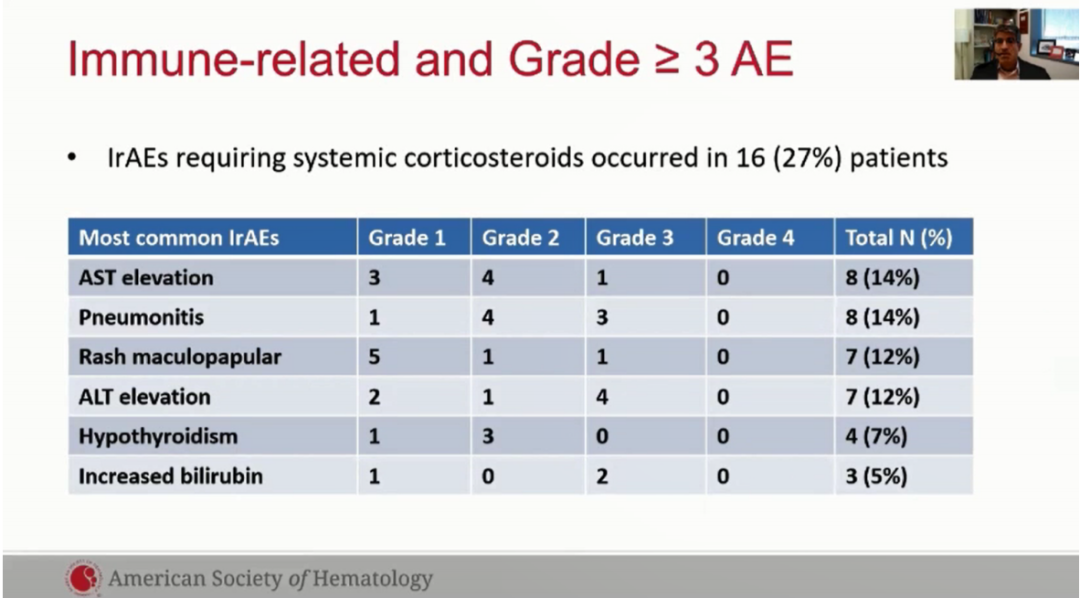 最常见的3-4级AEs是中性粒细胞减少(31%)、肺炎(7%)和ALT升高(5%)。18例(31%)患者发生需要使用全身性皮质类固醇的免疫相关(ir)AEs。最常见的≥2级irAE包括:肺部炎症(12%)、AST或ALT升高(8%)、甲状腺功能减退症(5%)和皮疹(3%)。