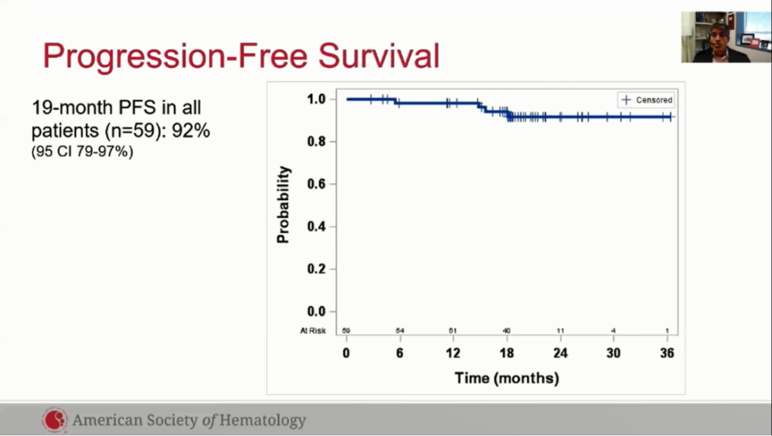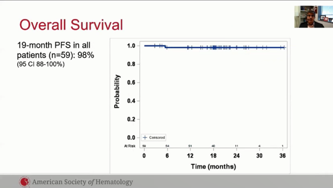 有效性方面:6例患者在HCT后基线时未达到CR(均为PR)。5例患者在研究治疗后转换为CR,1例患者保持PR而无PD。仅发生2例PFS事件,1例患者在15个月时复发,预防治疗后自行停药后发生PJP相关死亡。所有纳入评估患者的预估18个月PFS和OS分别为95%和98%。伴有2中或者3中以上风险因素患者的18个月PFS估计值分别为92%和89%。