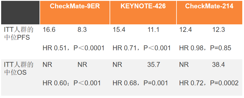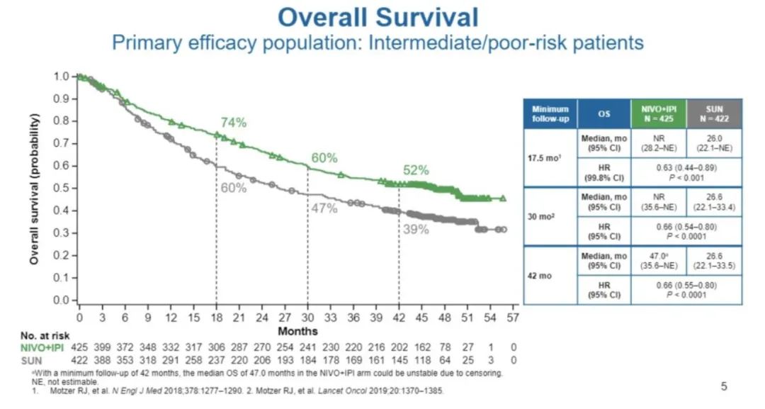 CheckMate-214是一项评价纳武单抗联合伊匹单抗(NIVO+IOI)对比舒尼替尼(SUN)一线治疗的大型3期研究,2020年ASCO-GU报道了研究的关键次要终点——IMDC中高危人群的OS。结果显示,双免治疗可显著延长患者中位生存(47.0 vs 26.6个月,HR 0.66,P<0.0001);ITT人群也有显著改善(NR vs 38.4个月,HR 0.72,P=0.0002)。