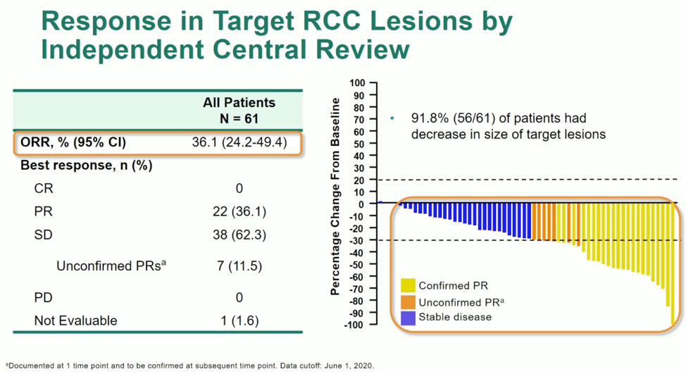 此外,乳头状肾细胞癌是临床上最常见的非透明细胞癌,其中1型多与MET基因驱动相关。近年来,针对MET的靶向药物也有新进展。2020年ASCO报道3期SAVOIR研究虽然未达到主要终点,但savolitinib相较于舒尼替尼也显示了具有临床意义的缓解率(27% vs 7%)。