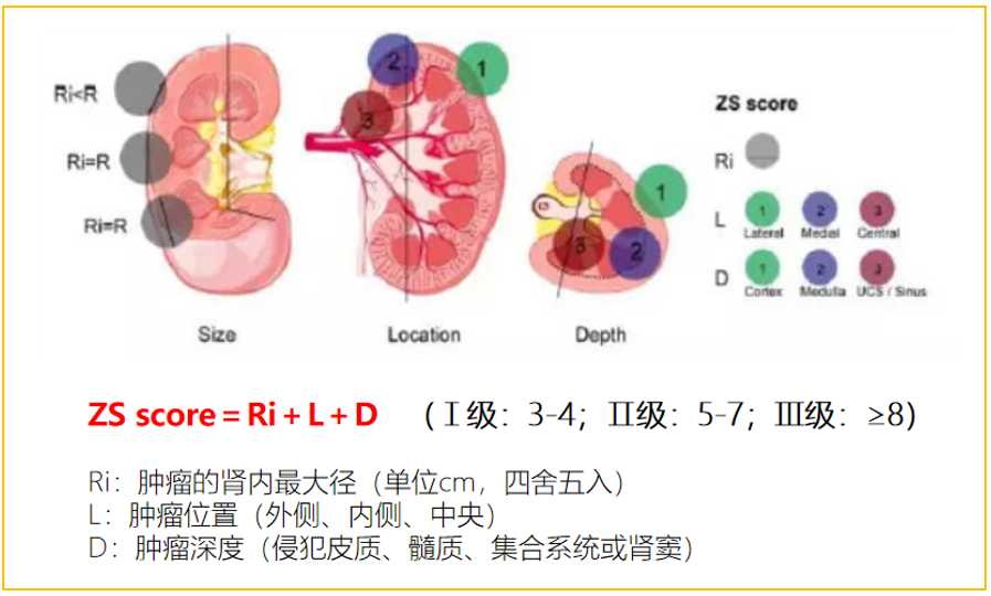该评分构成包括肿瘤的肾内最大径(Ri)、位置(L)、深度(D),具有简洁、实用、有效等特征,可准确判断肿瘤复杂程度和评估围术期预后,效果优于RENAL和PADUA评分。在ZS Score基础上,中山团队还改良和优化了不阻断肾动脉(零缺血)保留肾单位手术的评估系统,包括肾柱评分(NRC)和零缺血评分(ZII)等半定量和定量评估。
