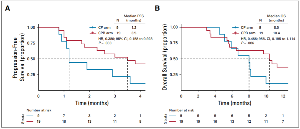 结果显示,研究达到了主要终点,相较于单独化疗,贝伐珠单抗联合卡铂和紫杉醇可显著延长患者PFS,降低54%的疾病进展风险(4.8 vs 3.0个月;HR 0.461,95%CI:0.306~0.695;P<0.001)。在次要终点方面,CPB方案显著延长患者OS,降低59%的死亡风险(13.6 vs 9.0个月;HR 0.611,95%CI,0.407~0.917;P=0.017);CPB方案的ORR也有显著提高(19.7% vs 13.2%,P=0.384)。研究没有观察到新的安全信号。