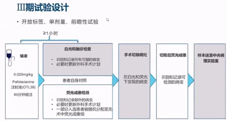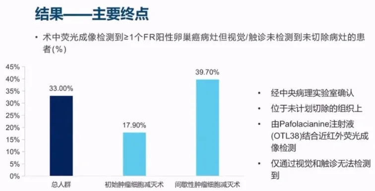 III期试验达到了主要终点,有33%(36位)的患者在术中检测到并切除计划外的额外肿瘤病灶。在接受间歇性肿瘤细胞减灭术的患者中,使用这种术中荧光成像方法,39.7%的患者在计划切除以外的组织上发现并切除了额外的病灶。