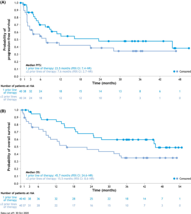 81例患者纳入研究,其中80例接受了Tafasitamab+来那度胺治疗并纳入整体分析。截至2020年10月30日(随访时间≥35个月),17例患者仍在继续Tafasitamab单药治疗。ORR为57.5%(n=46),其中完全缓解(CR)40%(n=32),部分缓解(PR)17.5%(n=14)。预估中位DoR为43.9个月(95% CI:26.1-NR),CR患者的中位DoR尚未达到(95% CI:43.9-NR);预估中位PFS为11.6个月(95% CI:6.3-45.7),预估36个月PFS率41.1%(95% CI:29.1-52.7);预估中位OS为33.5个月(95% CI:18.3-NR)。既往接受过1线和≥2线治疗患者的ORR分别为67.5%(n=27/40;CR:47.5%;PR:20.0%)和47.5%(n=19/40;CR:32.5%;PR:15.0%);预估中位DoR分别为43.9个月(95% CI:9.1-NR)和尚未达到(95% CI:15.0-NR);预估中位PFS和36个月PFS率分别为23.5个月(95% CI:7.4-NR)、47.8%(95% CI:30.2-63.4)和7.6个月(95% CI:2.7-NR)、34.3%(95% CI:18.6-50.7);预估中位OS为45.7个月(95% CI:24.6-NR)和15.5个月。治疗过程中未出现预期外毒性或新的安全性问题。最常报告的≥3级血液学TEAE为中性粒细胞减少、血小板减少、白细胞减少、贫血和粒细胞减少性发热。