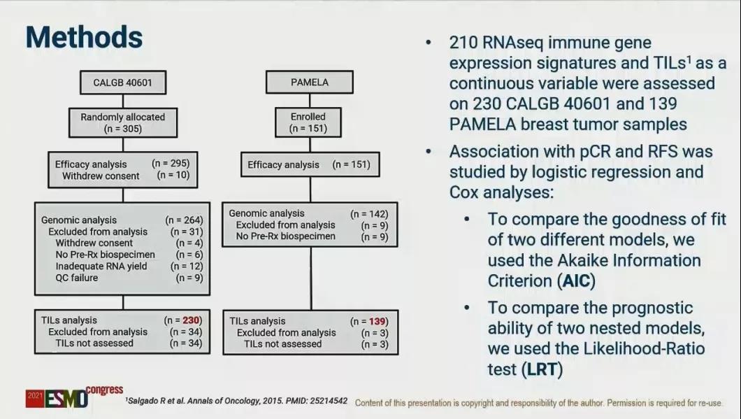 今年ESMO大会针对免疫基因特征于肿瘤浸润淋巴细胞作为预测因子的预测能力进行了比较,并发表数据,该报告题目为免疫基因表达特征vs肿瘤浸润淋巴细胞(TILs)在早期HER2阳性乳腺癌中的预后价值:一项CALGB 40601试验和PAMELA试验的联合分析。检测了免疫基因表达特征和肿瘤浸润淋巴细胞单独或联合对于2项不同的新辅助临床试验人群的预后价值。