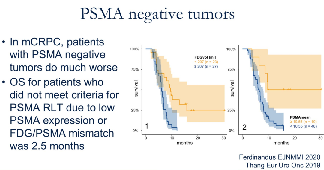 So heterogeneity on PSMA PET. How does that impact prostate cancer? So I would think of them in two different ways. So if you think about patients’ earlier stage—so patients with biochemical recurrence or at an initial stage—and there’s actually very low levels of heterogeneity within a patient. So patients are typically very homogeneous within the individual patient, but there can be heterogeneity across patients. So maybe 5 percent of patients will be negative on a PSMA PET and that will have, obviously, a limited sensitivity forcing metastatic disease. Now, overall, when you look at the literature in patients who have negative PSMA PETs, those patients do very well so it’s a positive prognostic factor (oddly enough), even though you’re not seeing where the disease is, potentially. Now, in the castration resistance setting, when you’re after chemotherapy, after abiraterone or enzalutamide and you’re heterogeneous—that’s a very poor prognostic factor, right? And so PSMA radioligand therapy in that setting is not going to be very good at targeting the entire extent of disease. And so patients who have mismatched FDG and PSMA uptake have incredibly poor outcomes. So it’s very different depending on the setting of disease where you’re at.