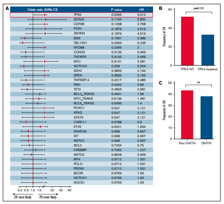 研究指出,该群体中TP53突变的发生率接近50%,远高于初治DLBCL患者中的比例,反映了TP53突变确为R/R DLBCL的预后不良因素;其他6种表观遗传学异常的分子特点也较突出,发生率均超过15%。由于尚不明确细胞免疫治疗(如CAR-T治疗)能否克服这些预后不良的分子特点,我团队石慧医生其中接受CAR-T治疗患者的遗传学异常与疗效进行分析。结果显示,CAR-T治疗能克服大部分细胞遗传学异常导致的预后不良。不同于既往的化疗,CAR-T治疗的疗效和预后受分子异常预后不良因素的影响较小,很多具有在化疗时代被认为不良预后分子异常的患者对CAR-T治疗仍有较好疗效。如果患者在初治阶段被发现携带有分子异常的预后不良因素,并且对化疗的疗效不佳,应尽早转化为细胞免疫治疗(如CAR-T治疗),可能改善其预后。不过,TP53突变对CAR-T治疗的疗效和预后影响还存在争议,我团队还将进一步探索伴有TP53突变患者的后续治疗方案。