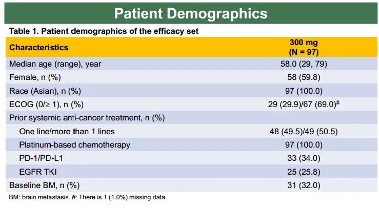 在WU-KONG6入组的97名患者中,中位年龄为58岁(范围为29-79岁),59.8%的患者为女性,所有患者均为亚洲人。此外,69%的患者ECOG PS评分≥1。在既往治疗方面,49.5%的患者接受过1线治疗,50.5%的患者接受过1种以上的治疗方案。既往治疗包括铂类化疗(100.0%)、抗PD-1/PD-L1治疗(34.0%)和EGFR-TKI(25.8%)。32%的患者出现基线脑转移。数据分析的截止日期为2022年7月31日。