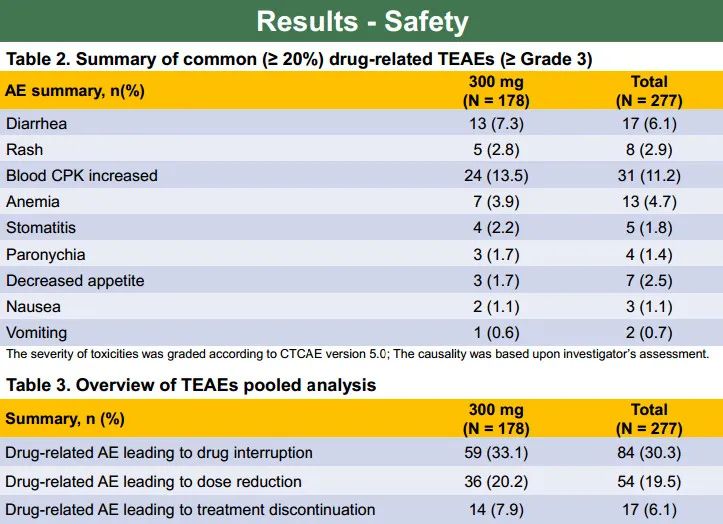 在接受300 mg舒沃替尼的患者中,最常见的≥3级治疗期间出现的不良事件(TEAE)包括腹泻(7.3%)、皮疹(2.8%)、血肌酸磷酸激酶(CPK)升高(13.5%)、贫血(3.9%)、口腔炎(2.2%)、甲沟炎(1.7%)、食欲下降(1.7%)、恶心(1.1%)和呕吐(0.6%)。
