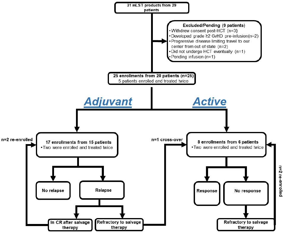 纳入移植后AML/MDS患者,分为活动性疾病组(治疗复发/难治患者)和辅助治疗组(维持移植后的缓解状态)。纳入标准包括预期寿命≥6周、既往移植在贝勒医学院进行、Karnofsky(或Lansky)PS评分≥50、器官功能符合试验要求(胆红素、血清肌酐≤2倍正常上限、且AST≤3倍正常上限,血红蛋白≥7 g/dl,室内脉指血氧饱和度>90%)、采取避孕措施、mLSTs可用、停止研究性抗肿瘤治疗≥1个月。输注mLSTs的时间与移植至少间隔30天,输注前所有患者均未经清淋化疗,输注后4周内进行疾病评估(至少进行骨髓检查)。