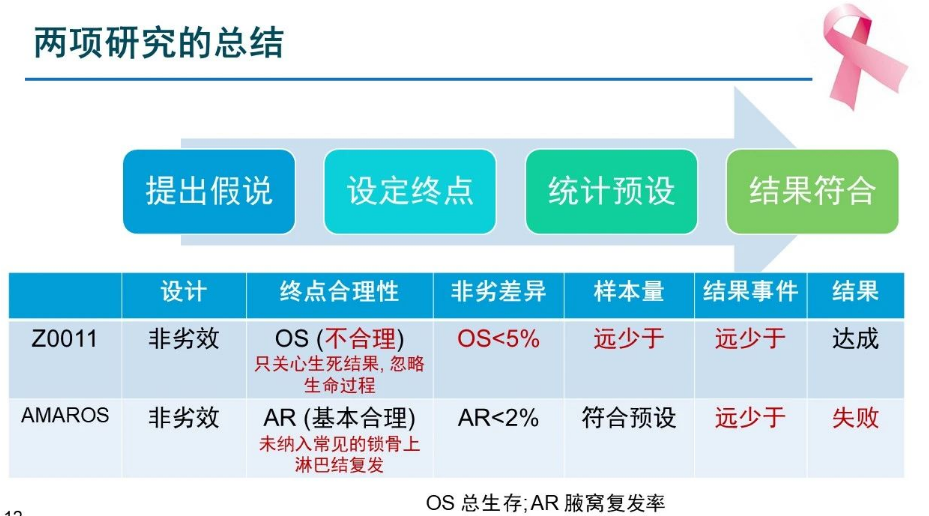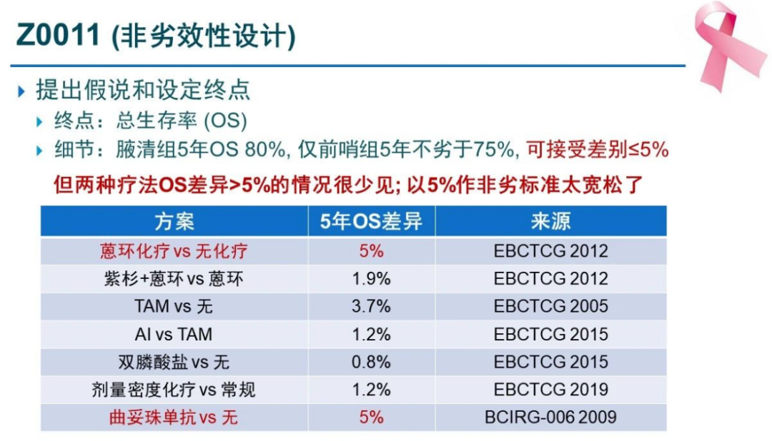 Z0011研究的终点设定为腋清组和仅前哨组的总生存(OS)率,腋清组5年OS率为80%,仅前哨组5年OS率不劣于75%,≤5%即认定为非劣效。然而在真实世界中,临床上两种药物或两种治疗手段的OS差异>5%的情况微乎其微,这样的设定意味着无论临床上如何操作,其OS差异都达不到5%以上,以5%作为非劣标准过于宽松。过于宽松的标准导致该临床研究提前终止,未能达到预期入组样本数和死亡事件数,也从设定之初就预示着该试验似乎不会失败。虽然Z0011研究结果得到了大家的认可,但个人认为其在研究终点的设定上存在问题。