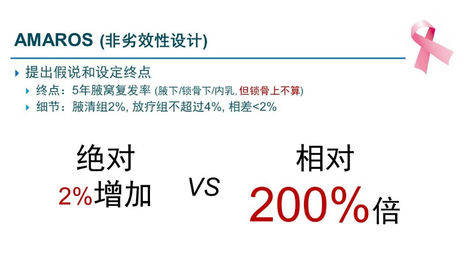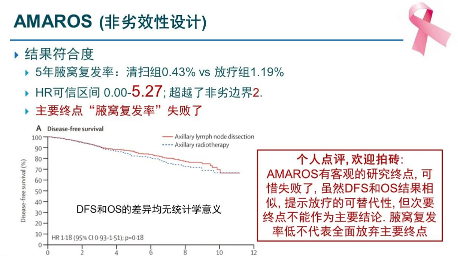 AMAROS研究最终结果显示,清扫组和放疗组5年腋窝复发率分别为0.43%和1.19%,虽远低于试验预设,但事实上放疗组的复发率是清扫组的2~3倍。此外,尽管预设的非劣边界高达2,但该研究最终的HR可信区间为0~5.27,远大于2,所以该研究的主要终点“腋窝复发率”失败了。虽然其次要研究终点DFS和OS结果相似,提示放疗的可替代性,但次要终点不能作为主要结论,腋窝复发率低不代表全面放弃主要终点。