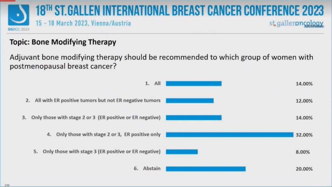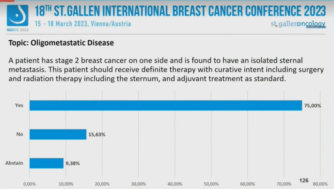 第18届St.Gallen国际乳腺癌大会(SGBCC 2023)于当地时间2023年3月15~18日在“世界音乐之都”维也纳拉举行。大会的最后一天,专家投票压轴登场。《肿瘤瞭望》整理了HER2阳性乳腺癌治疗、BRCA相关治疗、骨改良治疗、寡转移疾病和分子诊断专题的专家投票;并选择其中几个题目供读者投票,一起感受早期乳腺癌治疗决策的圣加仑氛围。