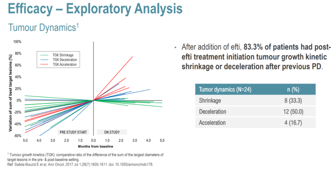 在肿瘤动力学的探索性分析中,添加eftilagimod治疗后,83.3%的患者在开始eftilagimod治疗后肿瘤生长动力学改变导致肿瘤缩小或肿瘤生长减速。24例患者中,8例(33.3%)肿瘤缩小,12例(50%)肿瘤生长减速,仅4例(16.7%)肿瘤生长加速。