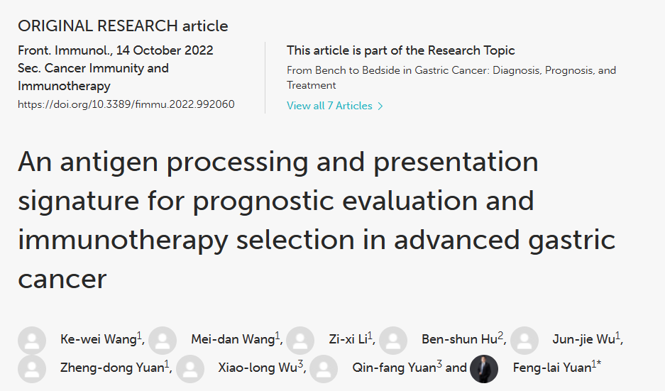 编者按:胃癌(gastric cancer,GC)是所有恶性肿瘤死亡中排名第四的癌症[1]。近年来已有几种免疫检查点抑制剂(ICIs)被批准用于晚期胃癌(aGC)患者的临床治疗[2.3]。但GC患者对ICIs的总体反应仅为20%至40%[4.5],因此迫切需要能够准确识别的生物标志物来筛选对ICIs治疗有反应的GC患者。该研究首次提出基于抗原加工和呈递相关基因的评分系统(APscore),并成功预测晚期胃癌的预后和对ICIs的反应,为个性化诊断和治疗提供依据。