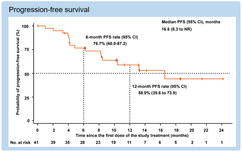 该研究是由上海市肺科医院周彩存教授牵头,评估卡瑞利珠单抗联合法米替尼一线治疗PD-L1表达阳性的晚期非小细胞肺癌(NSCLC)的多中心、开放标签Ⅱ期篮子研究,研究纳入41例既往未经系统治疗的晚期NSCLC患者(PD-L1 TPS≥1%),EGFR和ALK阴性,主要研究终点为RECIST v1.1评估的客观缓解率(ORR)。