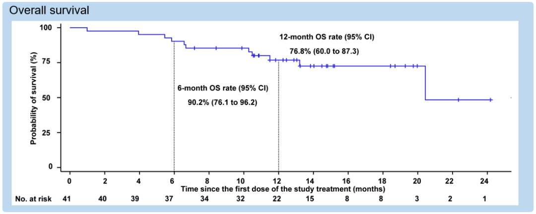 研究结果显示,ORR达53.7%,中位PFS长达16.6个月,1年PFS率达58.9%,近六成患者1年疾病未进展,高于既往公布的免疫联合化疗或免疫单药数据。中位OS尚未达到,1年OS率达76.8%。研究结果展现了法米替尼与卡瑞利珠单抗协同增效的作用,发挥了1+1>2的抗肿瘤效果。