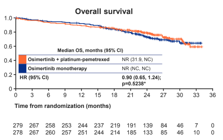 在近期举行的2023年世界肺癌大会(WCLC)上,总统研讨会(president Symposium)专场公布了FLAURA2试验的早期结果(摘要号PL03.13),该试验采用奥希替尼单药或奥希替尼联合卡铂/培美曲塞化疗一线治疗EGFR突变阳性(EGFRm+)非小细胞肺癌(NSCLC)患者。虽然FLAURA2证实联合治疗组的PFS有显著改善(25.5 vs. 16.7个月),但OS结果仍不成熟,但在我看来,OS曲线发生重叠,不能提示OS可能随着随访时间的延长而改善。
