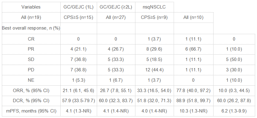 在Ⅱ期研究阶段,队列1共纳入PD-L1 CPS≥1、HER2阴性、初治晚期胃/胃食管结合部癌患者19例,有效率(ORR,客观缓解率)为21.1%,中位无进展生存期(mPFS)为4.1个月。队列3共纳入驱动基因阴性、既往含铂化疗和免疫治疗失败的非鳞非小细胞肺癌患者10例,有效率为10%,mPFS为6.2个月。队列2共纳入经治晚期胃/胃食管结合部癌患者27例,包含Ⅰb期研究中入组的胃癌患者,总有效率为33.3%,mPFS为4.0个月,在队列2中CPS≥5患者的有效率为77.8%,mPFS为10.3个月,明显优于其他患者。