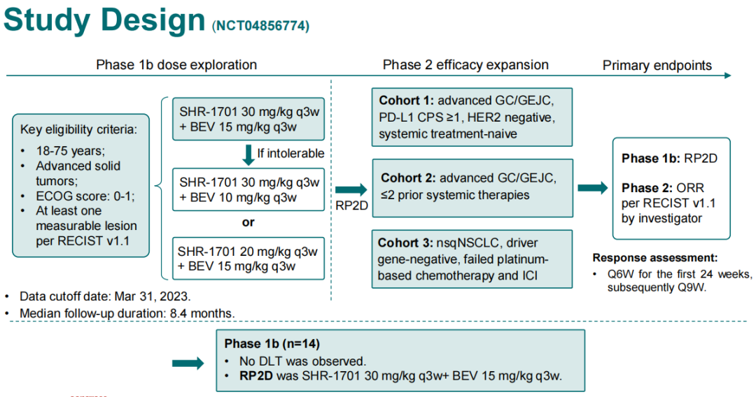 骆卉妍教授:首先给大家介绍一下研究结果,Ⅰb期研究主要是探索药物安全性和确定最佳剂量,共入组14例患者,安全性良好,未观察到DLT(Dose-limiting toxicity,剂量限制性毒性),最后确定的Ⅱ期推荐剂量为贝伐珠单抗15 mg/kg,SHR-1701 30 mg/kg,三周一次。