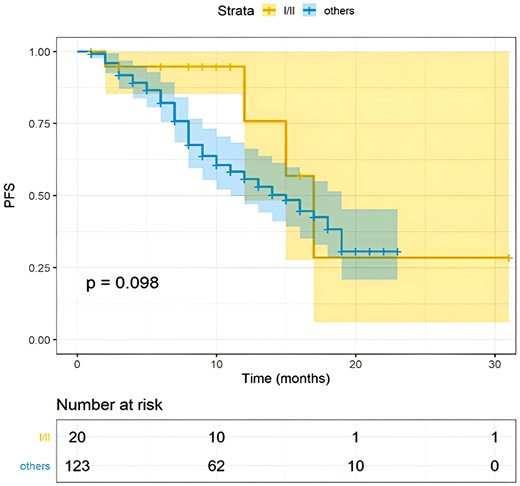 6、12和18个月时的rwPFS率分别为84%、59%和39%。与接受更后线治疗的患者相比,接受T-DXd作为晚期疾病一线/二线治疗的患者rwPFS在数值上更长(17 vs.15个月;HR 2.24,95%CI:0.89~3.96,P=0.098)。