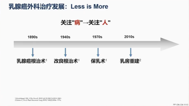 随着“以患者为中心的治疗理念”逐渐普及,乳腺癌的外科治疗也逐渐从关注“病”发展到关注“人”。乳腺癌患者的外科治疗也从最初的乳腺癌根治术逐渐发展到改良根治术、保乳手术、重建手术等,乳腺癌患者的手术切除范围越来越小,接受术后重建的比例也逐渐增高。早期乳腺癌患者的腋窝手术也逐渐呈现出降阶梯的发展趋势。