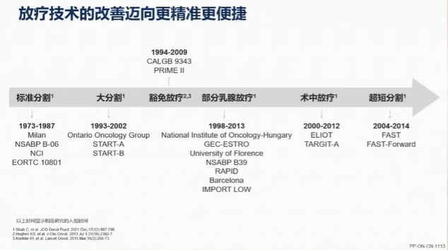 自放疗在临床应用以来,相关技术也逐渐改善,由最初的标准分割不断进行演变,大分割放疗、豁免放疗、部分乳腺放疗、术中放疗、超短分割放疗等使得乳腺癌患者的治疗变得更加精准,更加便捷。早期乳腺癌研究者协作组(EBCTCG)meta分析的数据显示,在保乳术后或乳腺切除术且腋窝清扫的淋巴结阳性患者中,术后放疗可降低复发和乳腺癌死亡率。