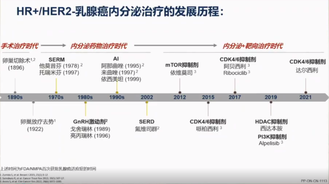 HR+/HER2-乳腺癌内分泌治疗的发展历程:从最初的手术治疗时代到内分泌药物治疗时代再到如今的内分泌+靶向治疗时代,HR+/HER2-乳腺癌患者的治疗越来越精准。对于早期高危患者的辅助治疗,通常有三种方式进行强化:延长内分泌治疗时间、联合OFS、联合CDK4/6抑制剂;对于早期低危患者的辅助治疗,则强调采用多基因检测工具辅助决策化疗进行降阶梯治疗,常用的工具有:70基因(MammaPrint)、21基因(Oncotype DX)、12基因(EndoPredict)。对于晚期HR+/HER2-晚期乳腺癌患者,治疗策略也是层出不穷:ET+CDK4/6抑制剂、ET+HDAC抑制剂、ET+PI3K抑制剂、ET+AKT抑制剂、ADC药物等治疗方案的出现,也使晚期乳腺癌患者有了更多治疗选择。针对HER2低表达乳腺癌患者的DB-04研究结果的公布,也使这类患者人群的治疗更加精准。