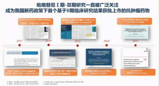 吡咯替尼针对HER2阳性乳腺癌患者的Ⅰ期-Ⅲ期研究一直被广泛关注,相关结果不断在国际会议上进行公布,并发表于高水平杂志,成为我国新药政策下首个基于Ⅱ期临床研究结果获批上市的抗肿瘤药物。