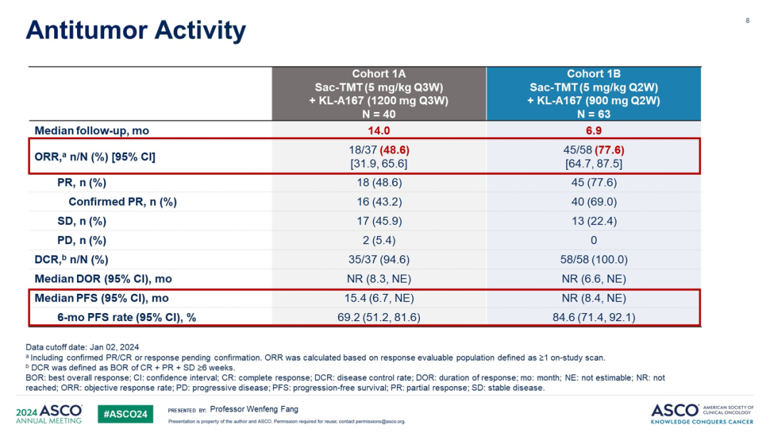 队列1A和队列1B的中位随访时间为14.0个月和6.9个月。队列1A的客观缓解率(ORR)为48.6%(18/37,2例待确认),疾病控制率(DCR)为94.6%。